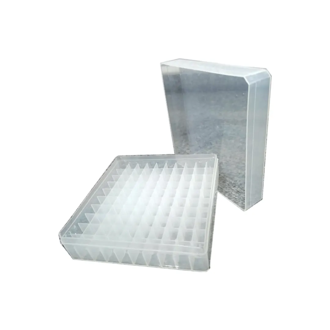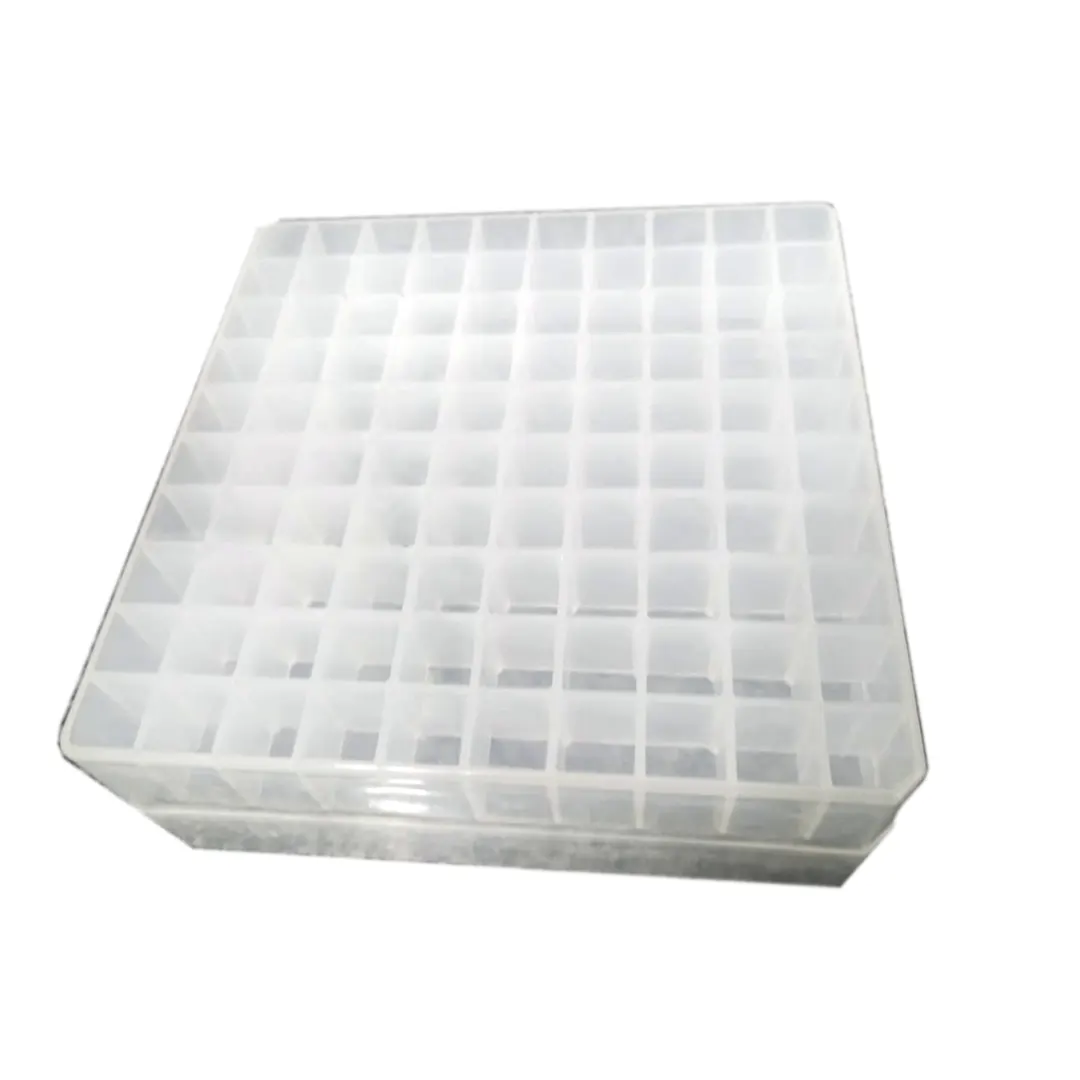 Rack de Polipropileno (PP), grade divisória com 100 furos quadrados, com tampa,  para Criotubos/Microtubos de 1,5/2mL – Registro ANVISA N°80815670007