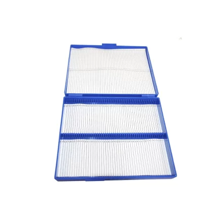 Fabricada em polipropileno (PP), disponível nas cores azul ou cinza. Capacidade de armazenamento para até 100 lâminas.