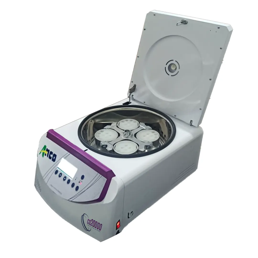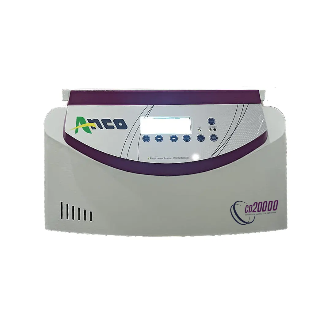 A centrifuga modelo CD-20000 da marca Anco é construída integralmente em chapa de aço carbono revestida com tratamento especial e pintura epóxi eletrostática de alta resistência. Possuí cuba interna de aço inox que facilita a limpeza.Este equipamento possui um display digital programável em LED com iluminação interna, que fornece indicação direta de velocidade (RPM) ou RCF, tempo em minutos e segundos programáveis (incremento de 50 em 50). Além disso, possui mensagens de erro para desbalanceamento, tampa aberta, problemas no motor e problema no sensor de velocidade.A abertura e fechamento da tampa desse equipamento é muito suave, graças ao eficiente amortecedor instalado. A tampa possuí um visor que permite ao usuário aferir ou fazer calibrações de rpm. A calibração pode ser realizada tanto de forma RBC (Rede Brasileira de Calibração) como rastreável.Possuí sistema de segurança que impede funcionamento do equipamento com a tampa aberta e impe sistemas de segurança. Um que impede o funcionamento do equipamento enquanto estiver com a tampa aberta ou impede a abertura da tampa enquanto o equipamento esteja funcionando. O outro que para o funcionamento do equipamento em caso de desbalanceamento anormal de rotores.