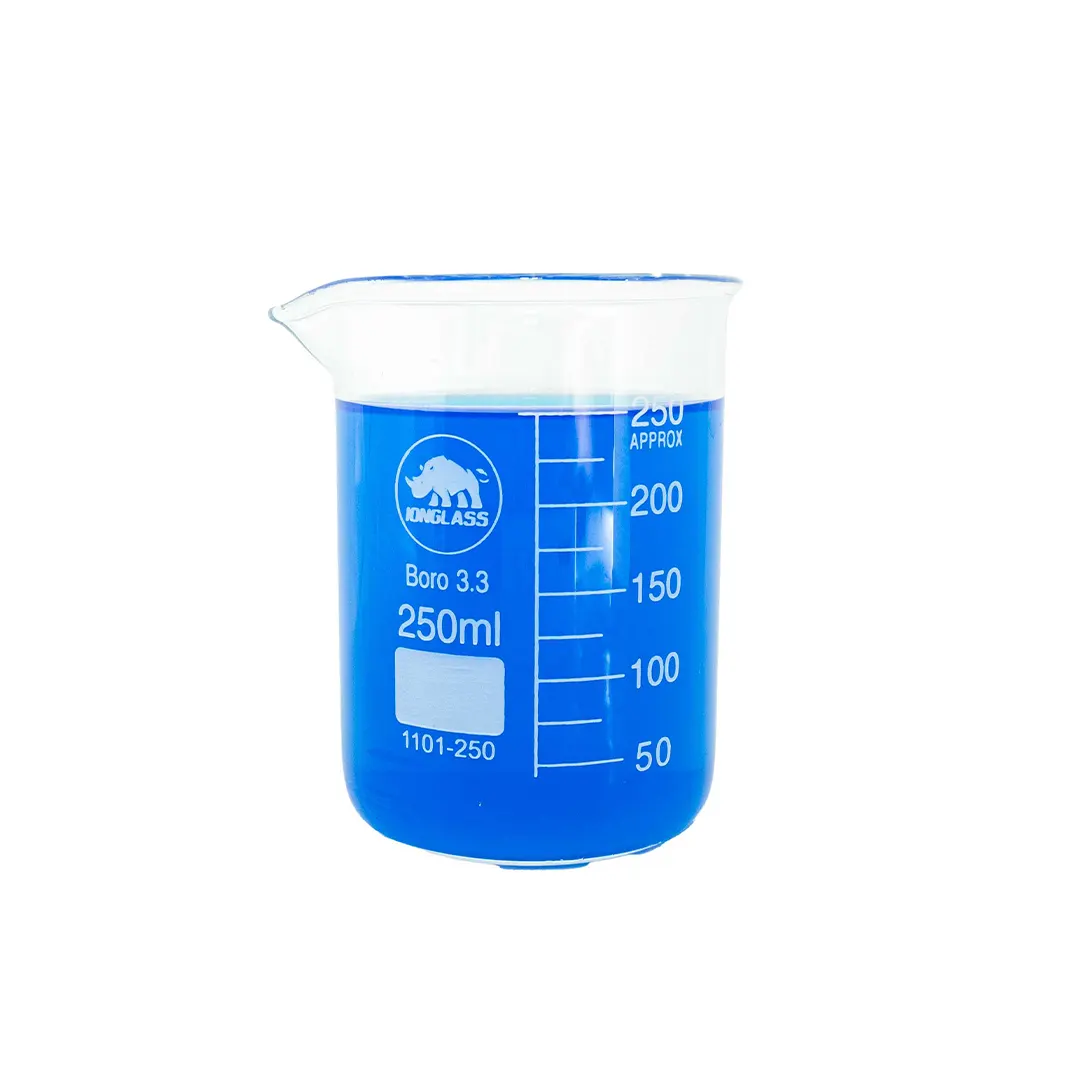 Copo de Béquer forma baixa 250ml.Produzido em vidro Boro 3.3, graduados em escalas simples.