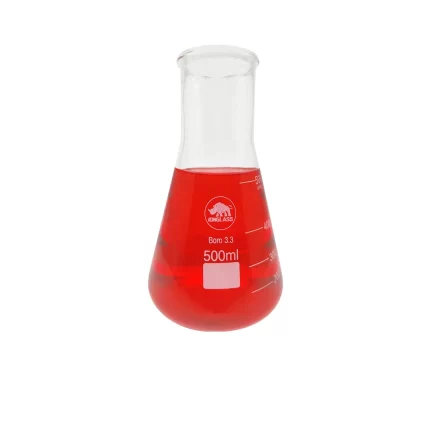 Frasco Erlenmeyer Boca Larga e reforçada de 500mL Produzido em vidro Boro 3.3, graduados em escalas simples.