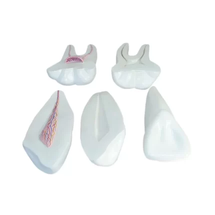 Este modelo mostra as diferenças morfológicas do incisivo, dentes caninos e molares. Dissecções dos dentes caninos e molares para demonstrar a estrutura do esmalte, cavidade da polpa dentária.