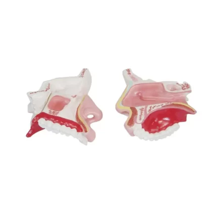 Modelo de estruturas externas e internas da cavidade nasal, é possível observar: Narina, fossas nasais, bulbo olfatório, seio frontal, epitélio olfatório, faringe, palato duro e mole, trato olfatório e parte da arcada dentária superior;
