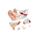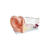 Modelo ampliado da orelha, utilizado no ensino da ciência elementar a consultórios ou universidades. Mostra os três principais órgãos componentes da audição (ouvido externo, ouvido médio, ouvido interno), além da posição do órgão de equilíbrio do corpo humano;