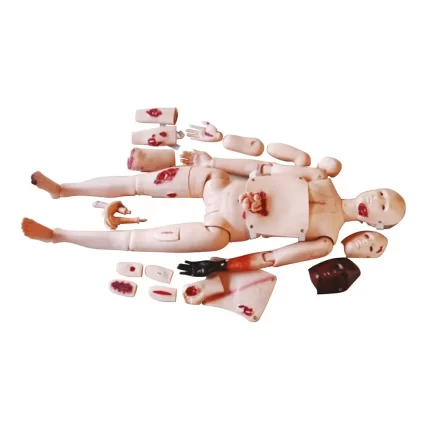 O simulador de trauma avançado é um manequim de PVC realista de corpo inteiro que simula realisticamente um paciente com trauma.Ele é projetado especificamente para treinar profissionais na área de atendimento de emergência e transporte de doentes e feridos. O simulador de trauma avançado consiste em 22 módulos. Ele pode ser anexado a várias partes do trauma no modelo de atendimento para simular uma variedade de traumas físicos, incluindo queimaduras faciais de 1.2.3 graus, lacerações, contusões, protuberância do intestino delgado, fraturas abertas, ferimentos à bala, facadas e um estranho metálico fratura de membros do corpo e outras lesões.
