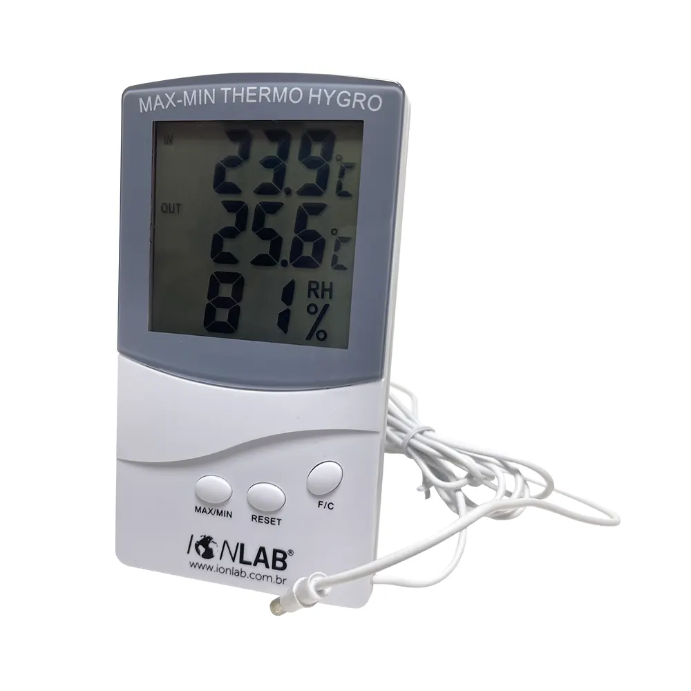Termo-higrômetro com medições de temperaturas interna/externa e umidade relativa.
